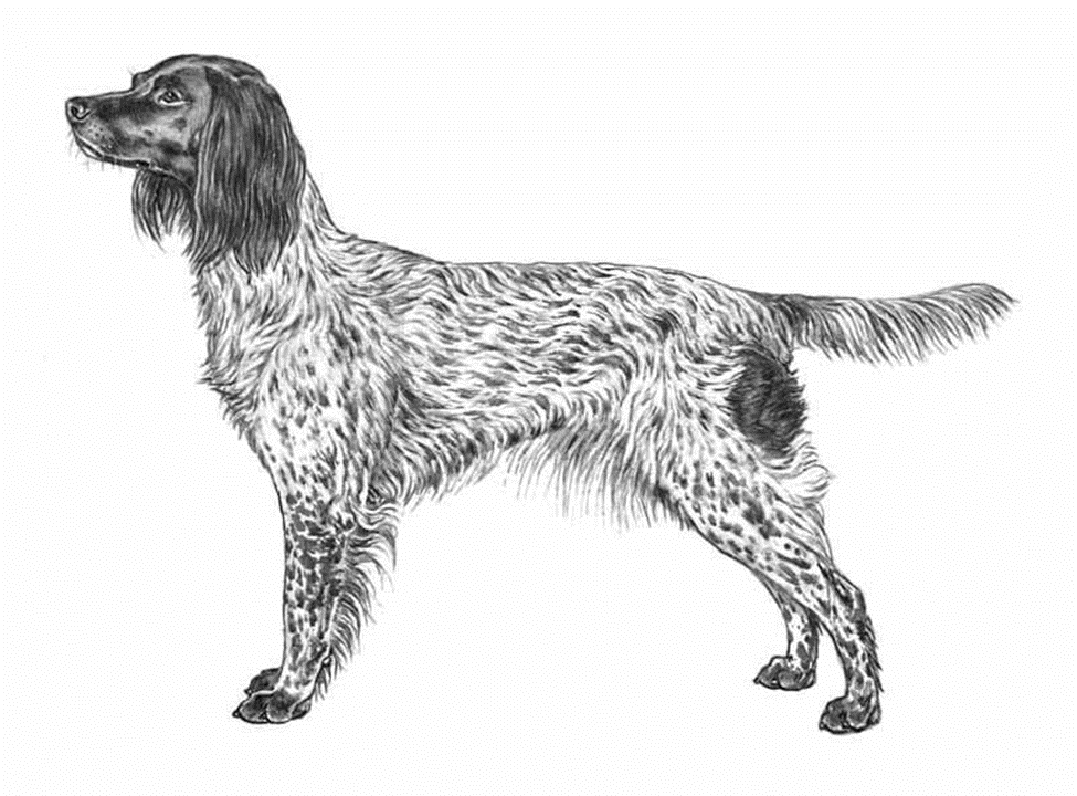 ШЕРСТЬ: Плотная, средней длины, прямая или немного волнистая, плотно прилегающая, водоотталкивающая. Контуры тела не должны быть скрыты слишком длинной шерстью. По своей плотности шерсть должна обеспечивать наилучшую защиту от непогоды, неблагоприятных условий на местности (в поле) и от травм. Короткая гладкая шерсть на ушах является недостатком. Задние стороны передних конечностей с очёсами, на задних конечностях штаны до скакательных суставов; хвост с длинным флагом и белым кончиком, обильная шерсть на передней части груди нежелательна.