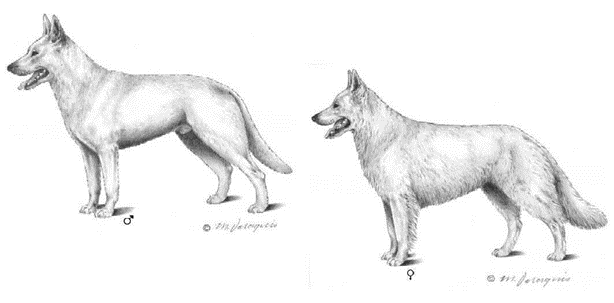 ОБЩИЙ ВИД: Белая овчарка – сильная собака с хорошо развитой мускулатурой, среднего размера, со стоячими ушами, двойной шерстью средней длины или длинной, удлиненного формата, среднего костяка и с элегантным, гармоничным силуэтом.