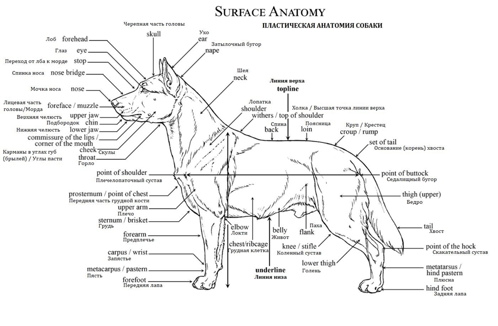 - Длина головы (измеренная от кончика мочки носа до затылочного бугра) соответствует половине длины линии верха (измеренной от холки до основания хвоста).