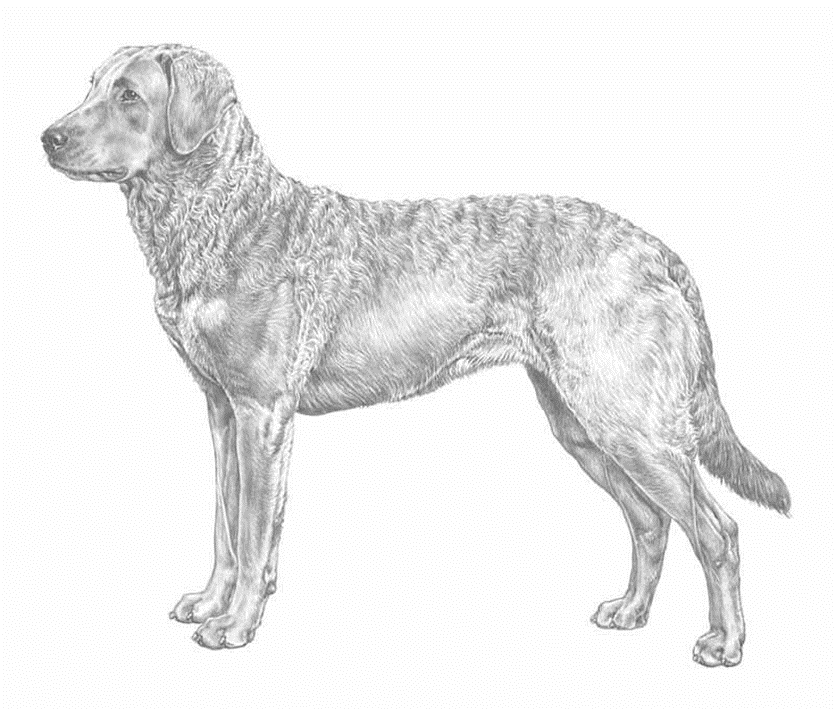 ОБЩИЙ ВИД: одинаково эффективный как на суше, так и на воде, Чесапик Бэй ретривер выводился на берегах залива Чесапик, как охотник на водоплавающую дичь в самых сложных погодных и водных условиях. Иногда ему приходится проламывать лед, делая многочисленные трудные подачи. Зачастую во время работы чесапик должен идти против ветра, плавать в ледяной воде. Свойства породы таковы, что они позволяют чесапику работать легко, эффективно и долго. Голова чесапика имеет широкий и округлый череп со средним переходом. Челюсти должны быть достаточной длины и мощности, чтобы легко и в то же время мягко подавать крупную птицу. Двойная шерсть состоит из короткой жесткой волнистой ости и плотного мягкого густого подшерстка, содержащего много естественной смазки и отлично подходящего для суровых ледяных погодных условий, в которых часто работает чесапик. Корпус чесапика крепкий, сбалансированный. Это собака мощного строения с корпусом и конечностями средней длины, с глубокой и широкой грудью, со строением плеча, позволяющим двигаться свободно, без тенденции к какой-либо слабости, особенно сзади. Мощь, между тем, не должна мешать подвижности или выносливости.