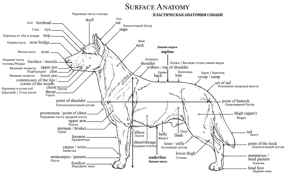 ОБЩИЙ ВИД: Собака среднего и выше среднего роста, крепкого сухого типа сложения, слегка растянутого формата. Кожа плотная, эластичная, без складок, мускулатура очень хорошо развита, особенно на задних конечностях и в области спины и поясницы, костяк крепкий, но не тяжелый.