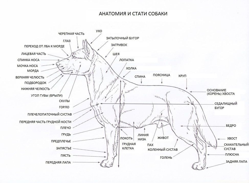 - Длина морды от мочки носа до перехода чуть больше длины черепа от перехода до затылочного бугра.