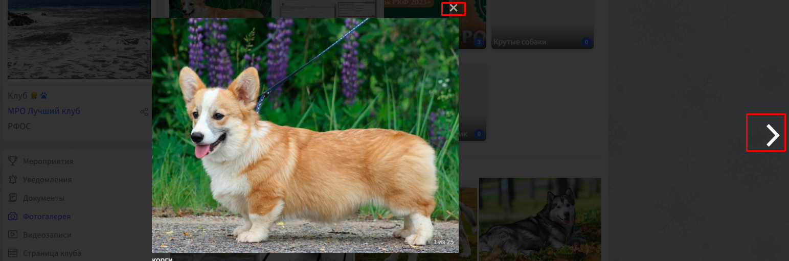 После нажатия кнопки "Загрузить", загруженные изображения становятся доступны для просмотра на личной странице клуба или питомника, а так же при переходе в раздел фотогалереи. Для просмотра конкретного изображения вам необходимо просто нажать на нужное изображение и оно откроется в всплывающем окне. Для навигации между изображениями при просмотре их в всплывающем окне вы можете использовать стрелки отображающиеся в правой и левой частях экрана. Для закрытия всплывающего окна необходимо нажать на кнопку закрытия (крестик) в его верхнем правом углу.