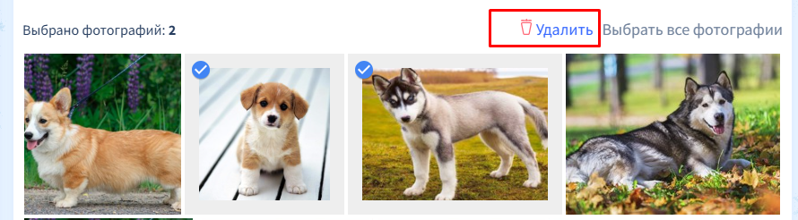 На открывшейся странице необходимо выбрать нужные для удаления изображения нажатием на верхний левый угол.
