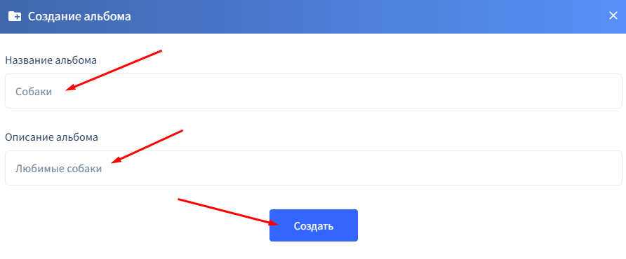 Можно указать название и описание альбома и затем добавлять фотографии.