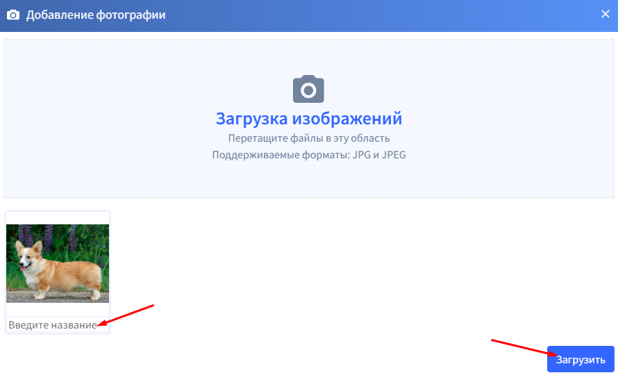 После выбора необходимых для загрузки в фотогалерею файлов и нажатия кнопки "Открыть" вы вернетесь на страницу редактирования, где вам будет предложено ввести названия загружаемых изображений (будут отображены при просмотре изображений) и подтвердить загрузку изображений нажатием кнопки "Загрузить"