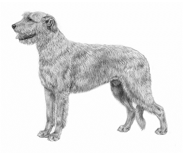 КРАТКАЯ ИСТОРИЧЕСКАЯ СПРАВКА: Известно, что континентальные кельты разводили борзых, вероятно, потомков тех, что изображены на египетских рисунках. Как и их сородичи на континенте, ирландские кельты проявляли интерес к разведению крупных волкодавов. Эти крупные ирландские волкодавы могли иметь гладкую или грубую шерсть, но позднее, возможно, из-за ирландского климата, грубая шерсть стала преобладать. Первый письменный отчет о таких собаках оставил римский консул в 391 г. до н.э., но они уже были известны в Ирландии в I веке н.э., когда Сетанта сменил свое имя на Кухулин (Пес Куланна). Упоминается, что в I веке кельтские племена, уходя в Шотландию, взяли с собой 150 собак с холма Уиснех (Uisneach). Ирландские волкодавы, несомненно, стали основой для породы шотландский дирхаунд. Пары ирландских волкодавов ценились как ценные подарки королевских домов Европы, Скандинавии и других регионов от Средневековья до XVII века. Их отправляли в Англию, Испанию, Францию, Швецию, Данию, Персию, Индию и Польшу. В XV веке каждое графство в Ирландии должно было содержать 24 волкодава для защиты стад от волков. Запрет Кромвеля (1652) на экспорт волкодавов помог сохранить их численность, но исчезновение волков и постоянный спрос за рубежом снизили их численность почти до исчезновения к концу XVII века.