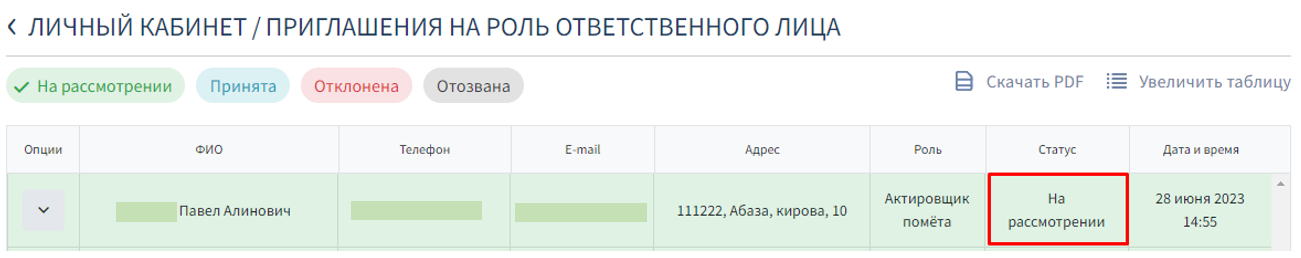 Пока Заявитель/Актировщик самостоятельно не подтвердит приглашение от Клуба, в личном кабинете Клуба в Реестре заявок будет отображаться статус "На рассмотрении"