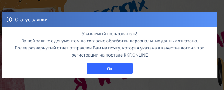Зайдите в почту, на которую регистрировали физическое лицо, найдите письмо от Робота РКФ, посмотрите причину отказа, сделайте исправления и отправьте бланк Согласия еще раз.