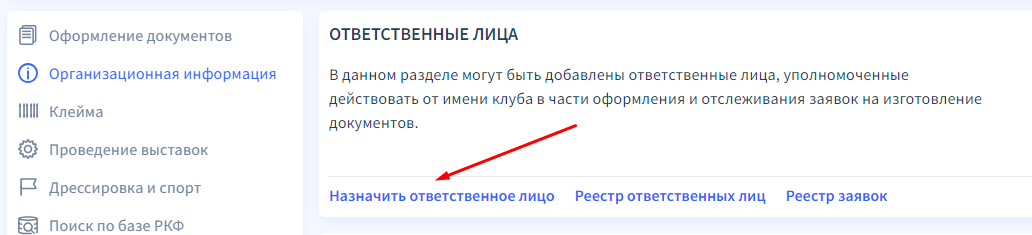 Заходите в личный кабинет клуба: Профиль - Личный кабинет - Организационная информация (слева) - Назначить ответственное лицо.