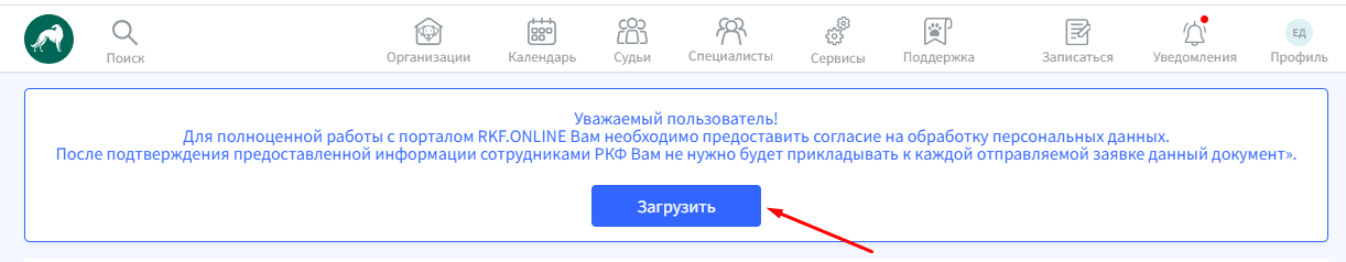 Вверху страницы будет расположен баннер с уведомлением о необходимости предоставить согласие на обработку персональных данных. Нажмите кнопку "Загрузить".