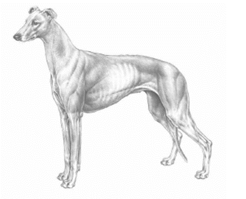 КРАТКОЕ ИСТОРИЧЕСКОЕ РЕЗЮМЕ: Эксперты, хотя и не единодушно, считают, что грейхаунд может быть родом с Ближнего Востока. Рисунки собак подобных грейхаунду были найдены на стенах древних египетских пирамид, и датированы они 4000-ми годами до нашей эры. Хотя собаки подобного типа распространены по всей Европе на протяжении многих лет, именно в Великобритании эти собаки приобрели окончательный облик и были стандартизированы. Как прототип так называемых борзых, ловчих собак, грейхаунд, хорошо известен большинству людей. Охотничья борзая, которая охотится на зайца (курсинг), - вот то, из чего развился беговой грейхаунд, и только гепард превосходит его в скорости. Во время бегов один грейхаунд показал скорость в 45 миль/час (это 72,4205 км/час).