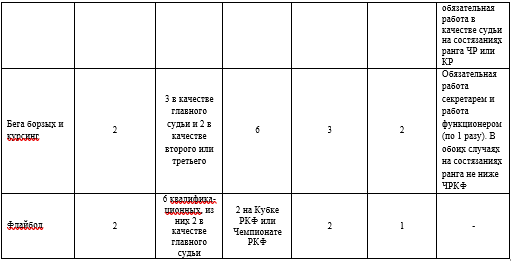 должны выполнить требования, указанные в столбцах «количество лет судейского стажа» и «количество самостоятельно отсуженных мероприятий».