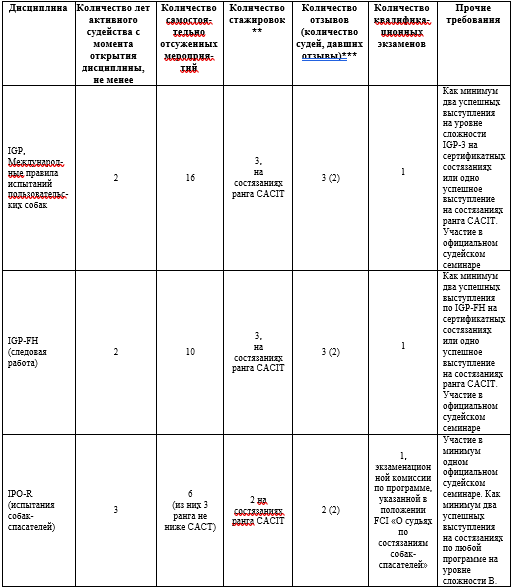 В зачет идет только судейство международных и национальных сертификатных состязаний в качестве главного судьи |