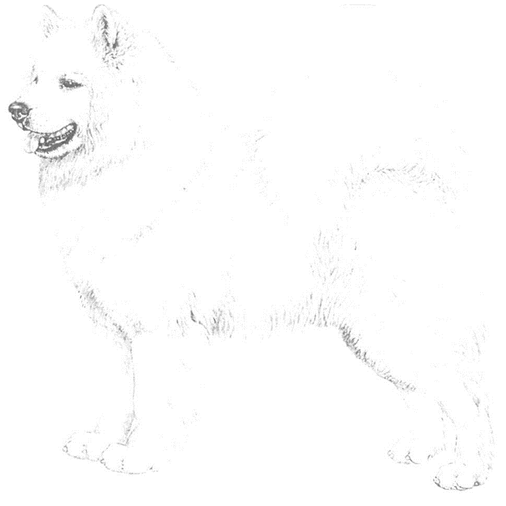 ОБЩИЙ ВИД: Средних размеров, элегантный, белый арктический шпиц. Производит впечатление мощности, выносливости, обаяния, послушания, достоинства и уверенности в себе. Так называемая «улыбка самоеда» формируется сочетанием формы и расположения глаз и немного приподнятых вверх уголков пасти. Половой диморфизм явно выражен.