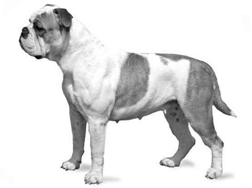 ОБЩИЙ ВИД: Короткошерстная (гладкошерстная), атлетического сложения, почти квадратного формата среднего размера собака в типе бульдога. Несмотря на компактное телосложение, континентальный бульдог подвижен и вынослив, даже при быстром движении его дыхание должно быть бесшумным. Половой диморфизм ярко выражен.