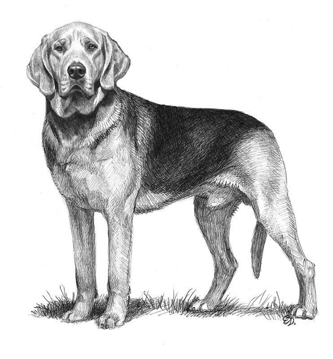 ОБЩИЙ ВИД: Гончая среднего размера, мускулистая, довольно тяжелого типа сложения, обеспечивающая выносливость, но не скорость.