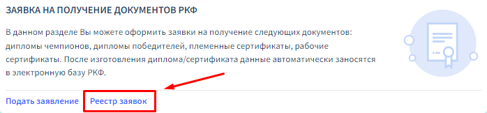 В Личном кабинете, в блоке «ЗАЯВКА НА ПОЛУЧЕНИЕ ДОКУМЕНТОВ РКФ» нажмите на «Реестр заявок».