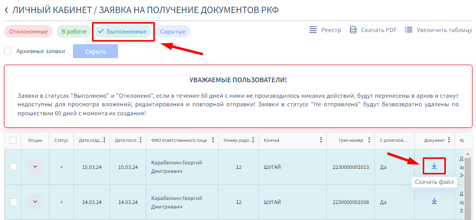 В открывшемся окне, нажмите на «Выполненные». Найдите нужную заявку и нажмите на «стрелочку» в столбце «Документ». Скачивание начнется автоматически.