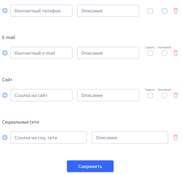 Для редактирования доступны поля "E-mail", "Сайт" и "Социальные сети". Также можно добавить дополнительный контактный телефон.