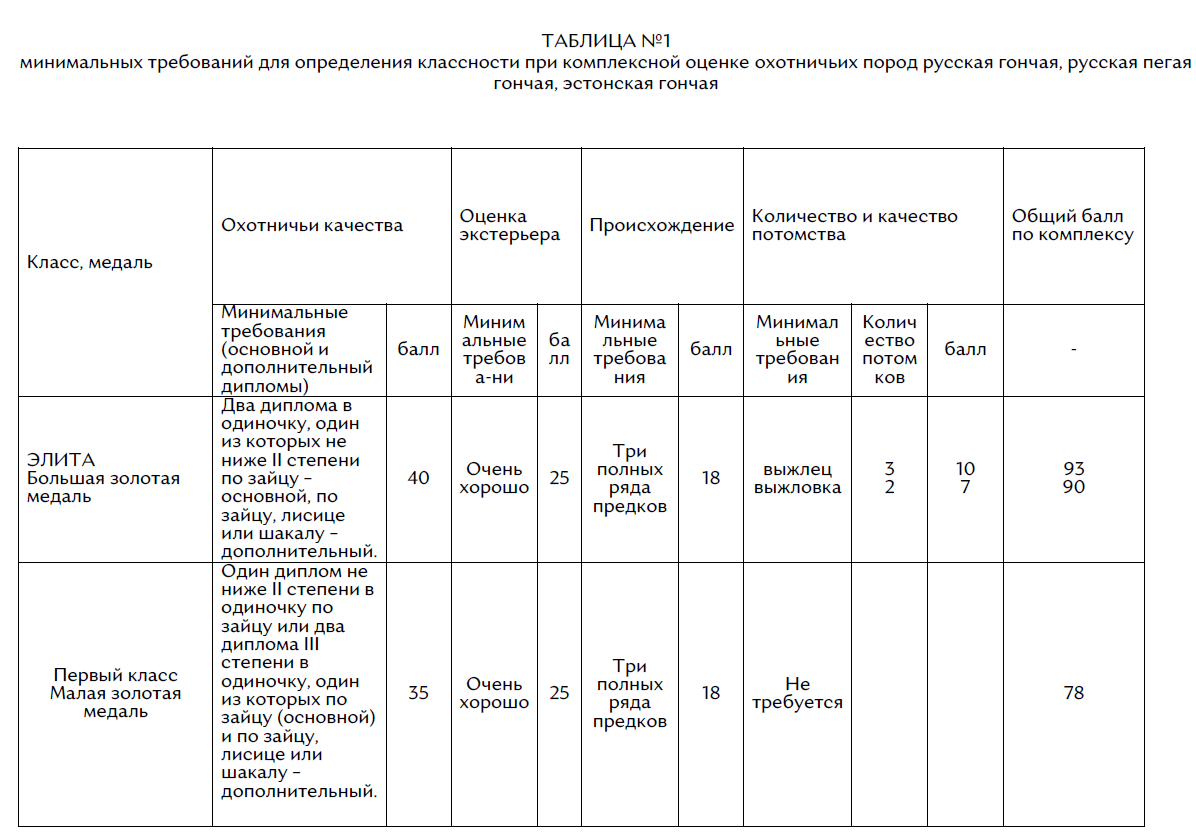 9.Собаки, прошедшие комплексную оценку, распределяются по четырем классам: элита, первый, второй, третий класс согласно таблице № 1.