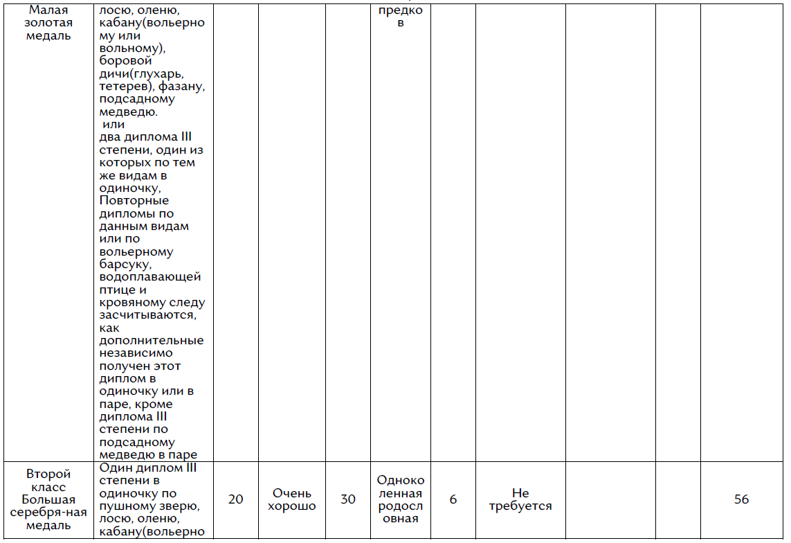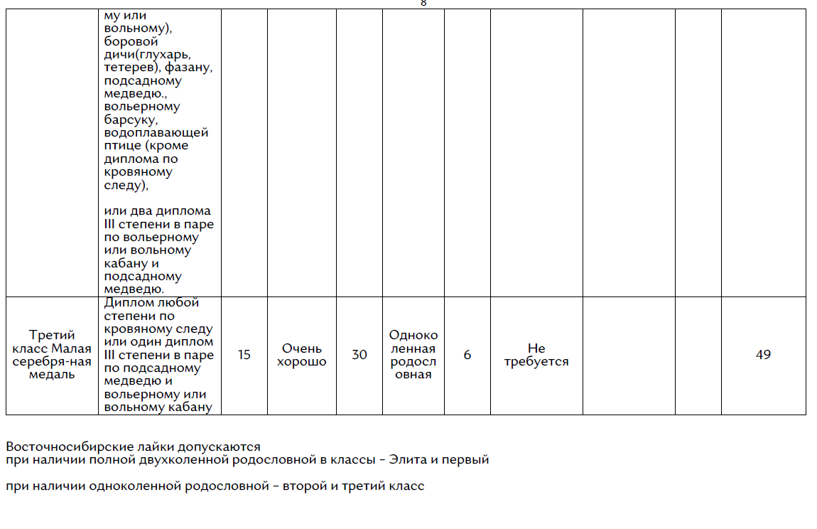 8.2. Баллы за каждого потомка начисляются по следующей образом: за оценку экстерьера «отлично» – 3 балла, «очень хорошо» – 2 балла; за диплом по охотничьим качествам I степени – 3 балла, II степени – 2 балла, III степени – 1 балл.