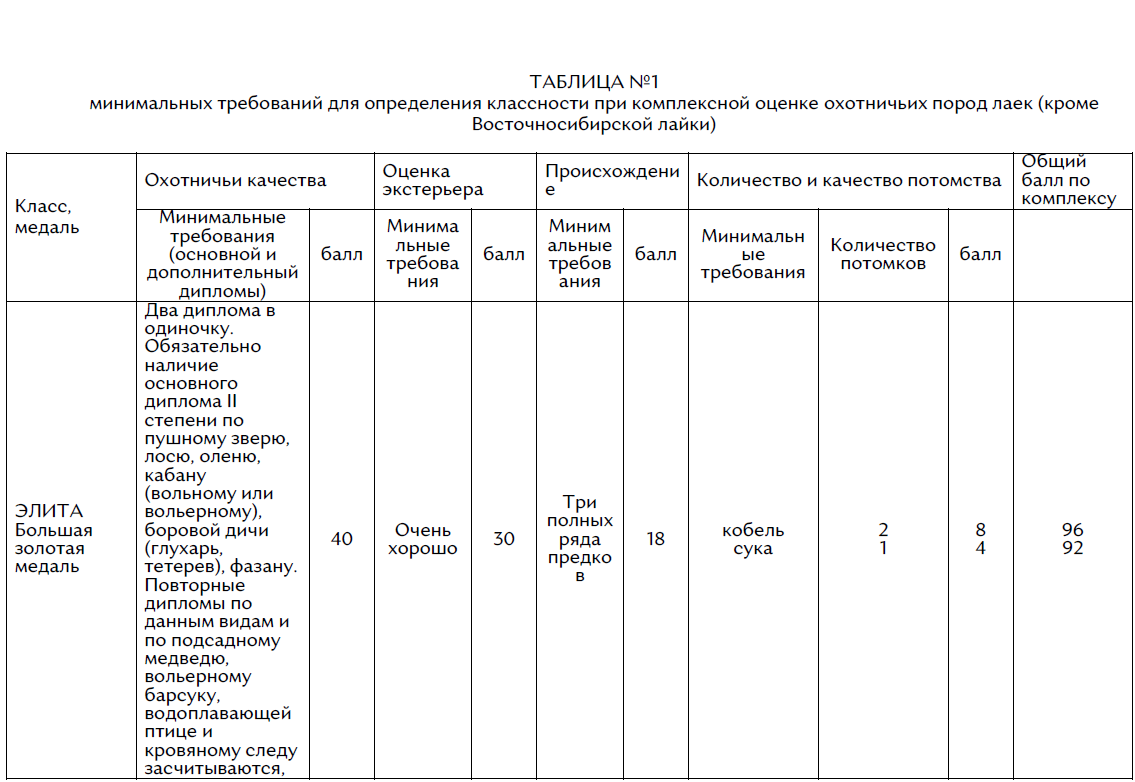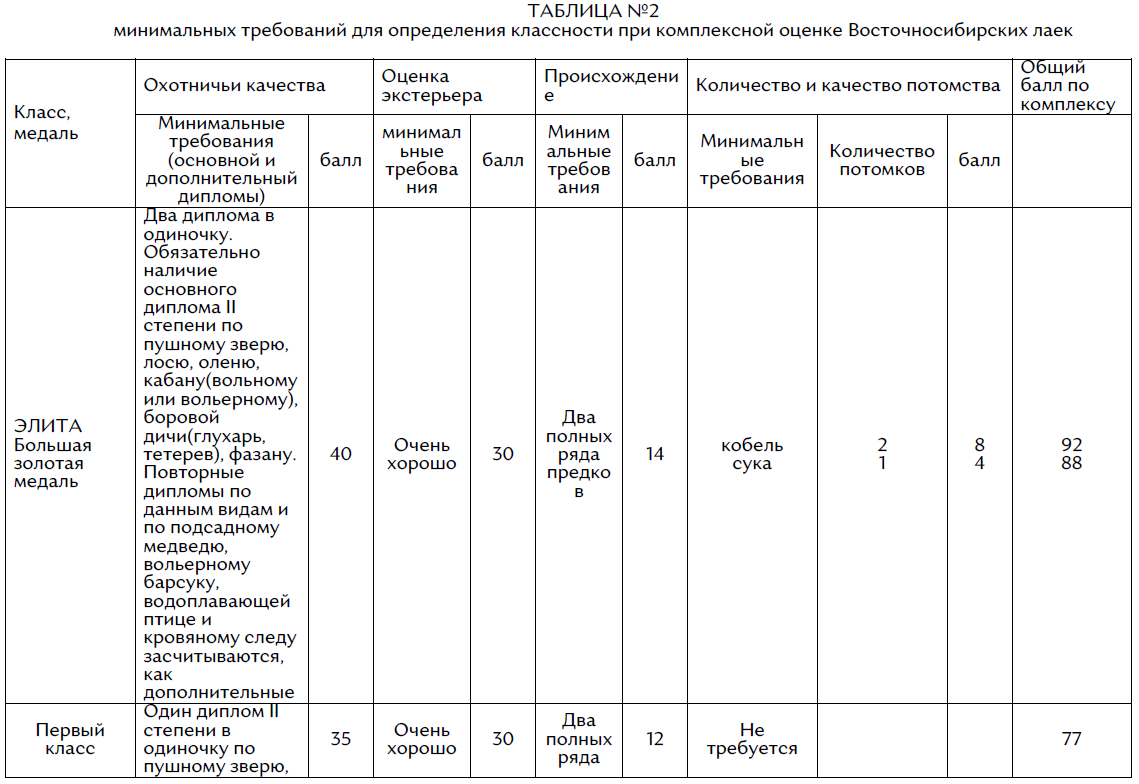 9.Собаки, прошедшие комплексную оценку, распределяются по четырем классам: элита, первый, второй, третий класс согласно таблице № 1 (2).