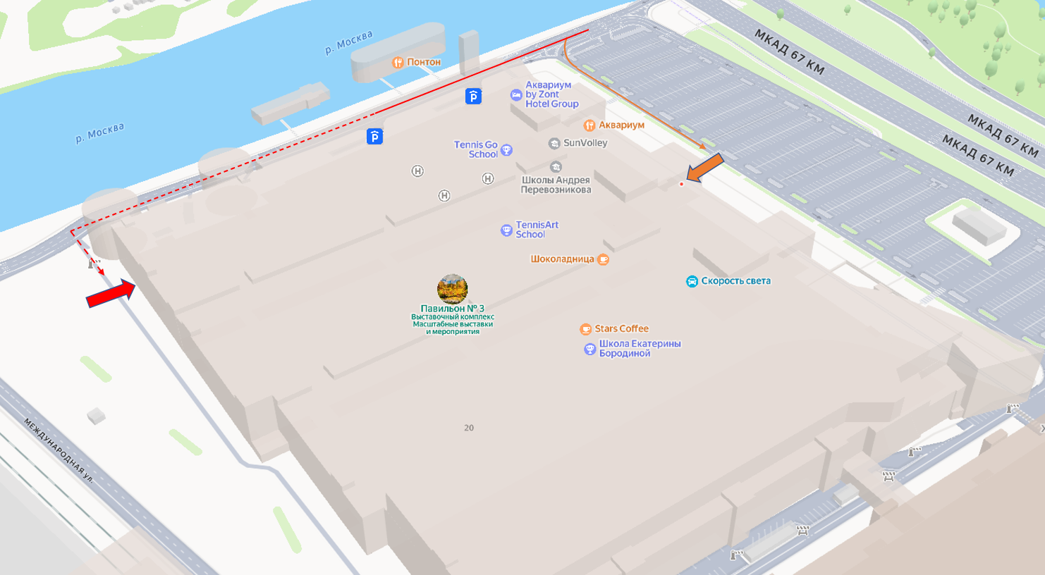 Проход без собак осуществляется через главный вход (оранжевая стрелка)