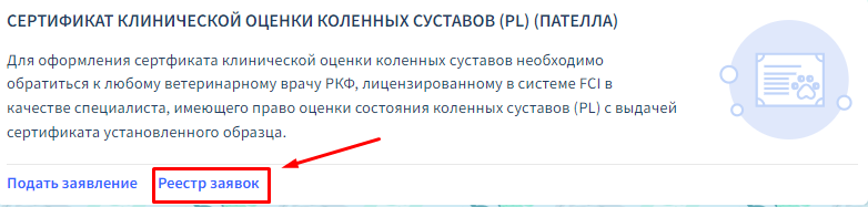 Далее в разделе «СЕРТИФИКАТ КЛИНИЧЕСКОЙ ОЦЕНКИ КОЛЕННЫХ СУСТАВОВ (PL) (ПАТЕЛЛА)» выберите «Реестр заявок».