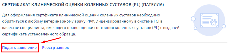 В блоке «СЕРТИФИКАТ КЛИНИЧЕСКОЙ ОЦЕНКИ КОЛЕННЫХ СУСТАВОВ (PL) (ПАТЕЛЛА)» нажмите на «Подать заявку».