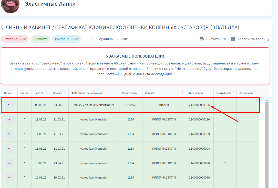 В открывшемся окне, в таблице вы сможете увидеть список отправленных заявок с трек-номерами.