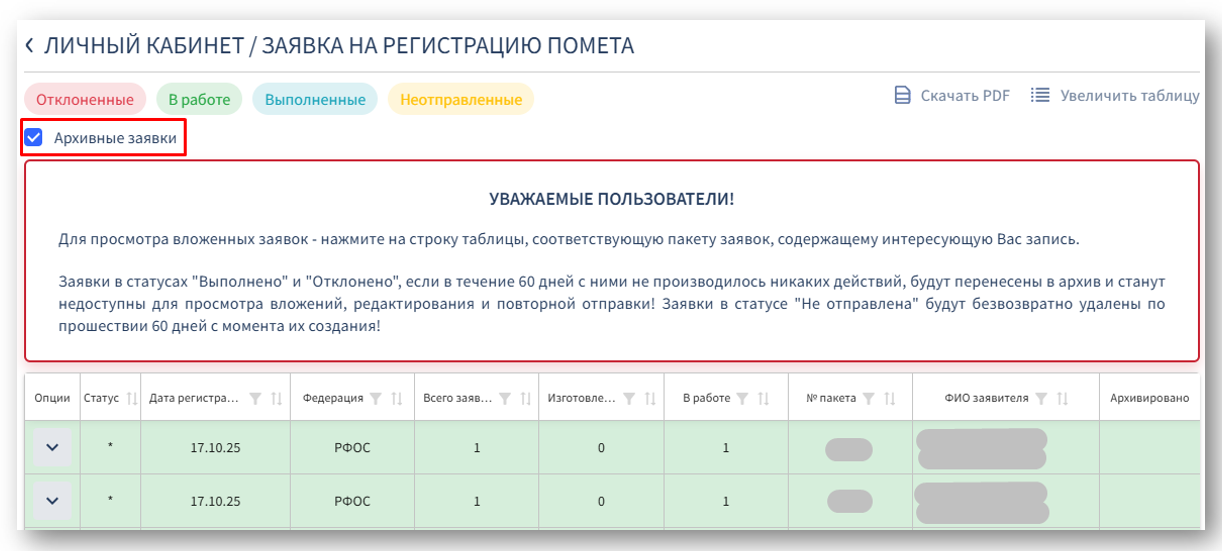 Далее в левом верхнем углу поставьте галочку Архивные заявки.
