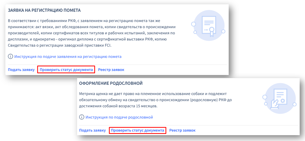 Затем нажмите Проверить статус документа в блоке ЗАЯВЛЕНИЕ НА РЕГИСТРАЦИЮ ПОМЕТА или ОФОРМЛЕНИЕ РОДОСЛОВНОЙ.