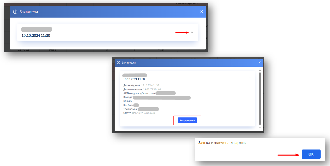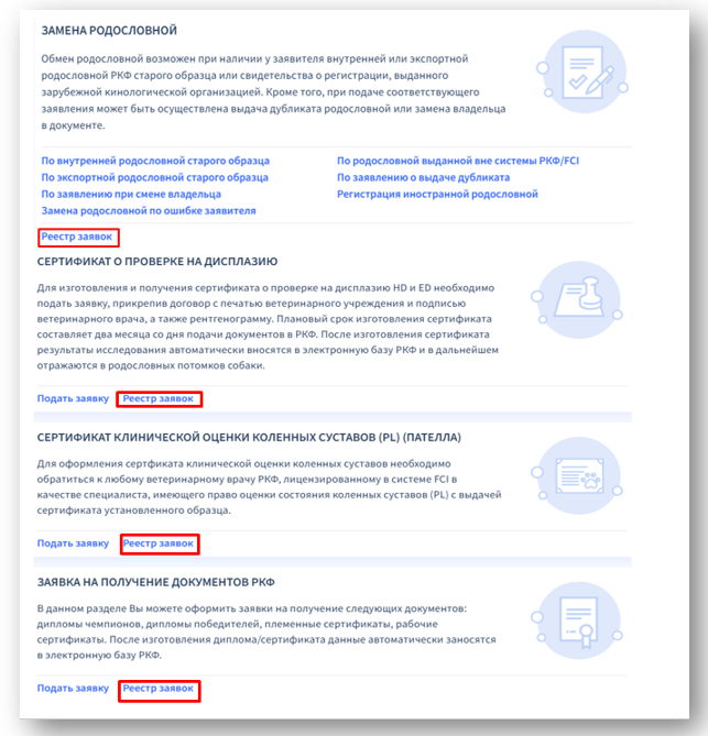 Чтобы восстановить из архива заявку на замену родословной, оформление дипломов или сертификатов, перейдите в раздел Реестр заявок в соответствующем блоке.