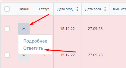 В строке заявки нажмите на галочку в первом столбце "Опции" и выберите в меню пункт "Ответить". Перед вами откроется форма заявки, где вы сможете ознакомиться с замечаниями, которые будут указаны на красном фоне в начале страницы или внутри определенной заявки.