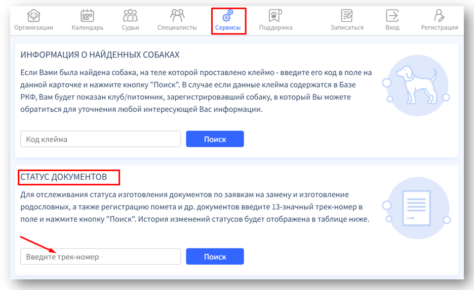 Статус поданной заявки можно проверить через раздел Сервисы, указав её трек-номер в поле блока СТАТУС ДОКУМЕНТОВ.