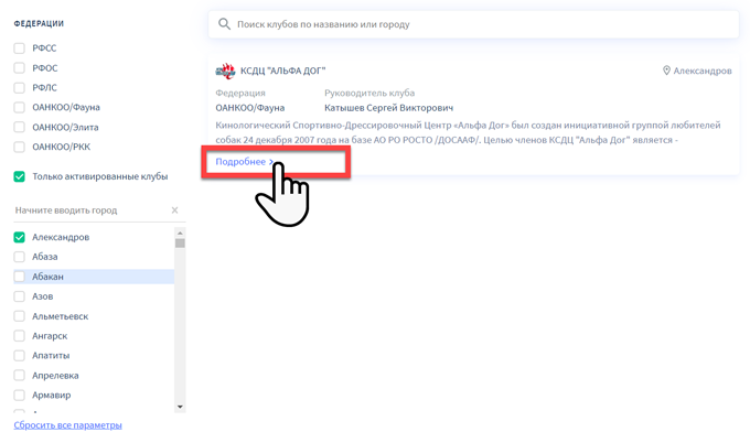 При нажатии на кнопку «Подробнее» вы перейдете на страницу данного клуба, где будет представлена более подробная информация.