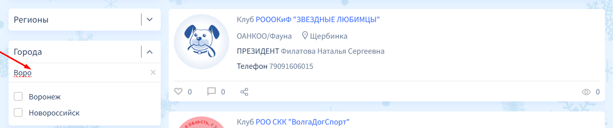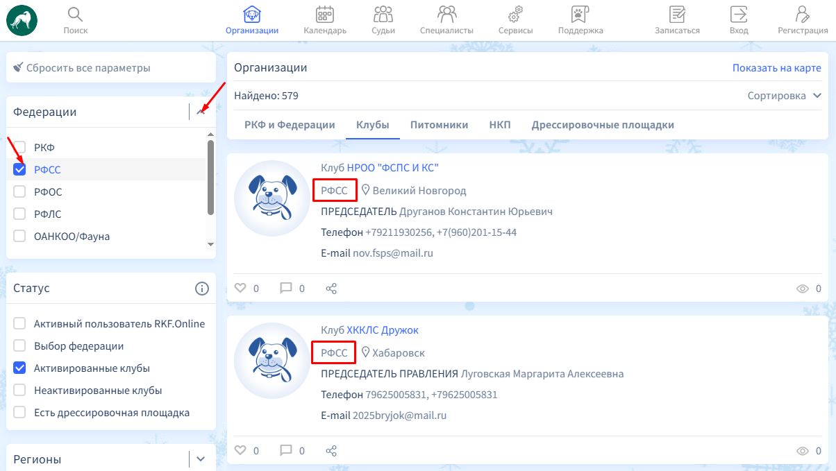 Для удобного поиска в реестре клубов реализован фильтр по федерациям. Для просмотра клубов, принадлежащих определенной федерации, нажмите галочку рядом со строкой "Федерации", далее на пустой квадрат рядом с названием федерации, чтобы отметить её галочкой.