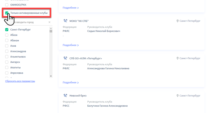 Также вы можете ограничить перечень клубов исключительно клубами, зарегистрировавшимися в системе. Для просмотра только активированных клубов, щелкните на пустой квадрат рядом с пунктом «Только активированные клубы», чтобы отметить его галочкой.