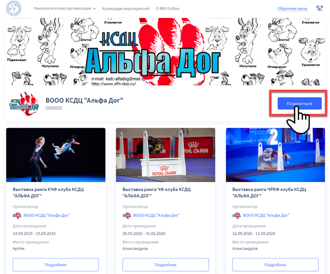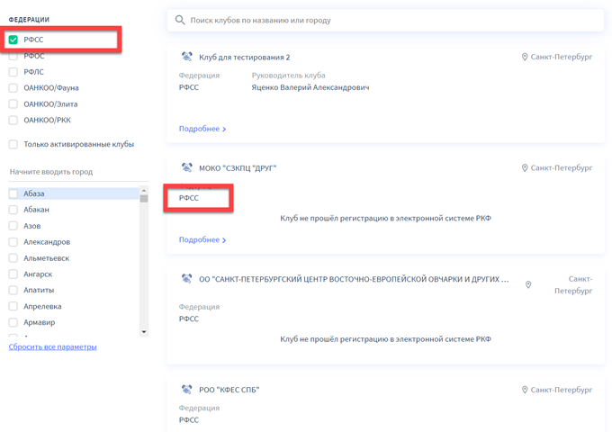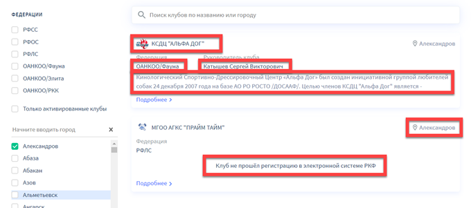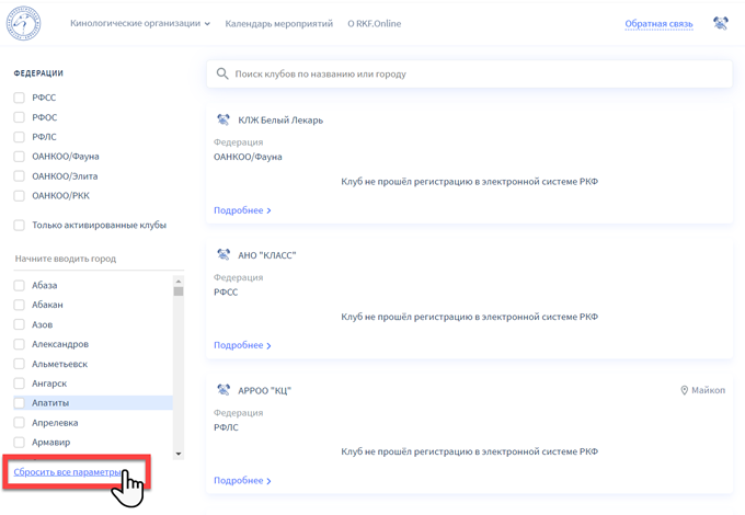 Для клубов, которые не прошли регистрацию на портале RKF.Online будет отображена соответствующая информация.