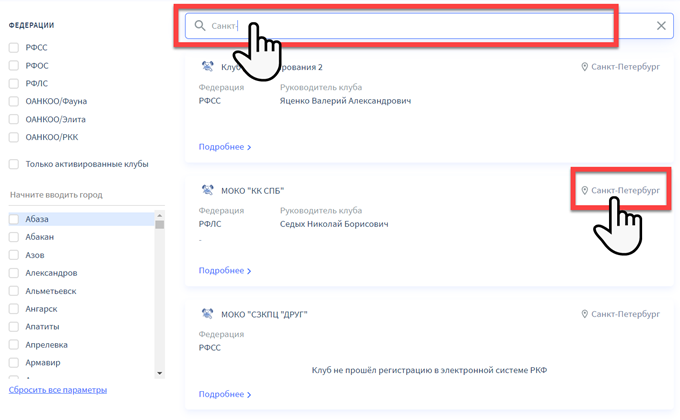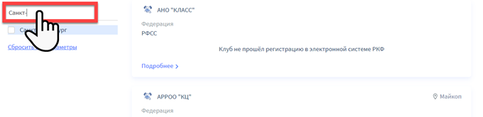 Для поиска в реестре клубов по всем выставкам в системе у вас есть возможность ввести в строку общего поиска любой текст. Введите город, название клуба и нажмите Enter на клавиатуре.