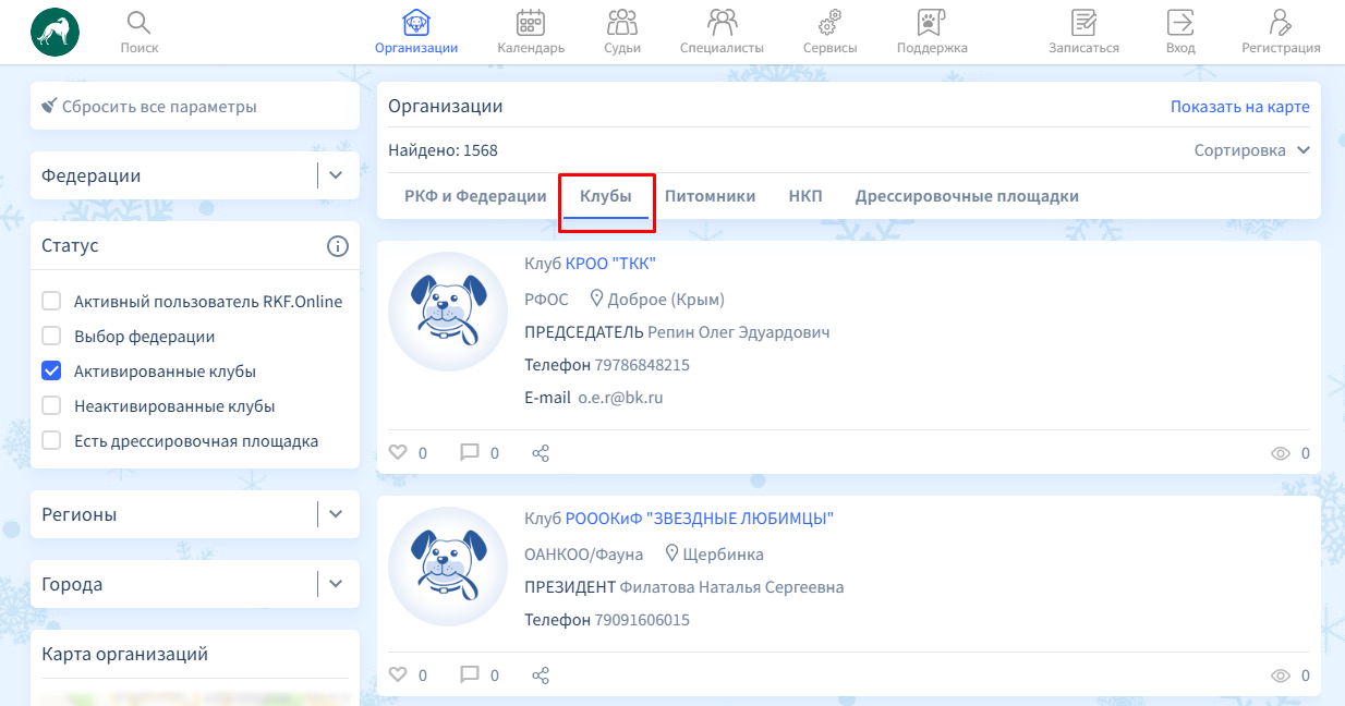 Для перехода на страницу реестра клубов в верхнем меню платформы нажмите на пункт «Организации». Откроется страница с кинологическими организациями, по умолчанию отобразится вкладка "Клубы".