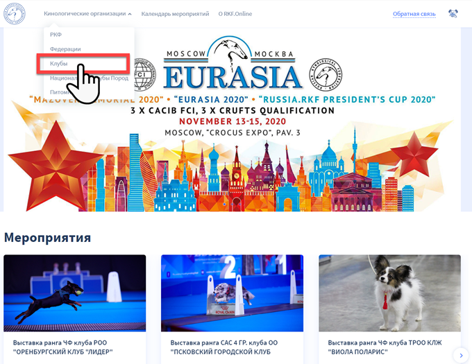 Для перехода на страницу реестра клубов в верхнем меню платформы нажмите на пункт «Кинологические организации» и далее выберете пункт выпадающего меню «Клубы».