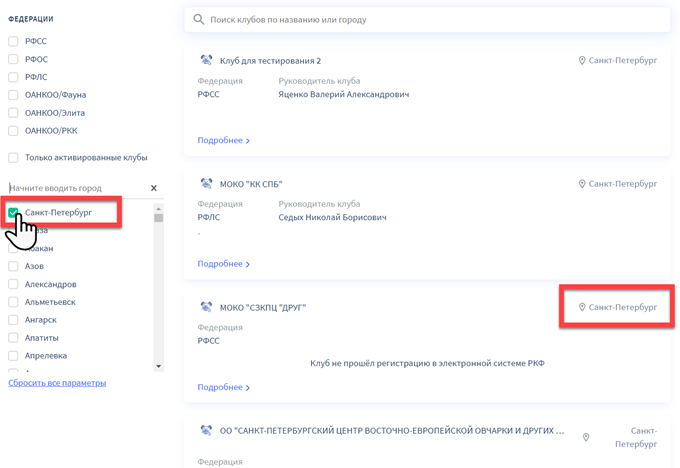 Кроме того, на карточке клуба в списке справа указан город, при нажатии на него список будет также отфильтрован по указанному городу.