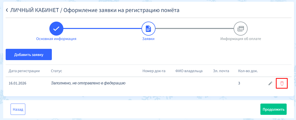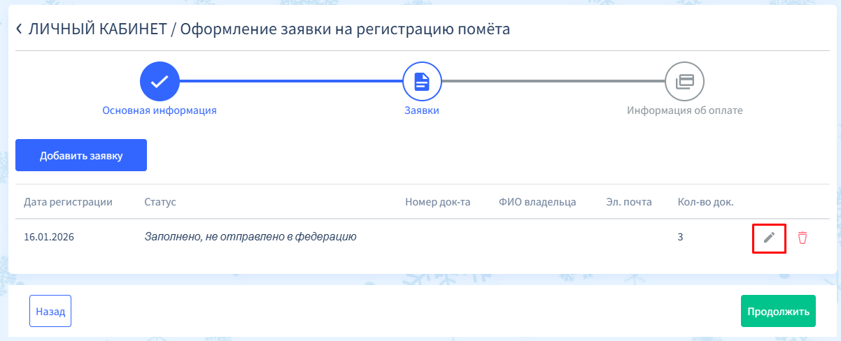 Для редактирования или удаления данных уже созданной заявки необходимо: