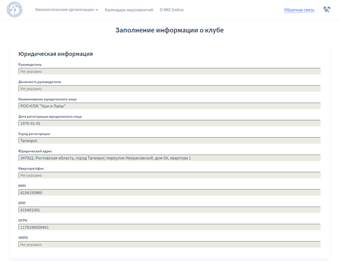 Так вы попадете на второй шаг регистрации. На данной странице представлены юридические данные клуба. Ознакомьтесь с ними, убедитесь в их корректности. Если вы обнаружили ошибки в данных, которые нельзя изменить самостоятельно, напишите по этому поводу в РКФ при помощи формы обратной связи в меню.