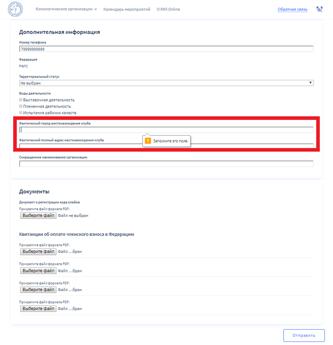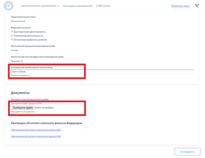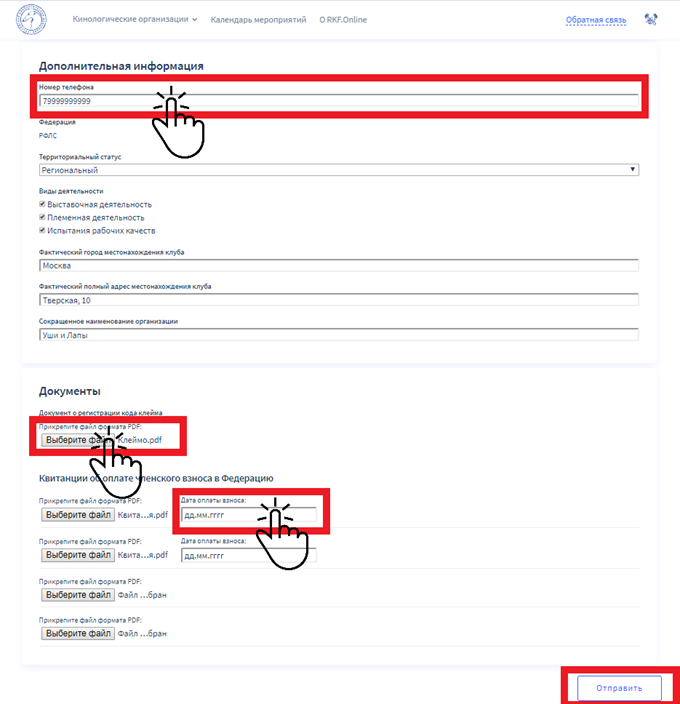 При пролистывании страницы вниз вы увидите следующие поля. На данном этапе также требуется указать некоторые данные клуба в целях дальнейшей авторизации. Для этого нажмите на пустые поля и введите запрашиваемую информацию, выберите территориальный статус из списка и укажите вид или виды деятельности. Далее вам необходимо прикрепить несколько документов в формате PDF. Для этого нажмите на кнопку «Выбрать файл» и прикрепите необходимый файл с вашего компьютера. Вы можете прикрепить до 4-х квитанций по 1-ой на каждую Федерацию, также после прикрепления укажите дату оплаты взноса в соответствующем поле. По завершении всех действий кликните на кнопку «Отправить».
