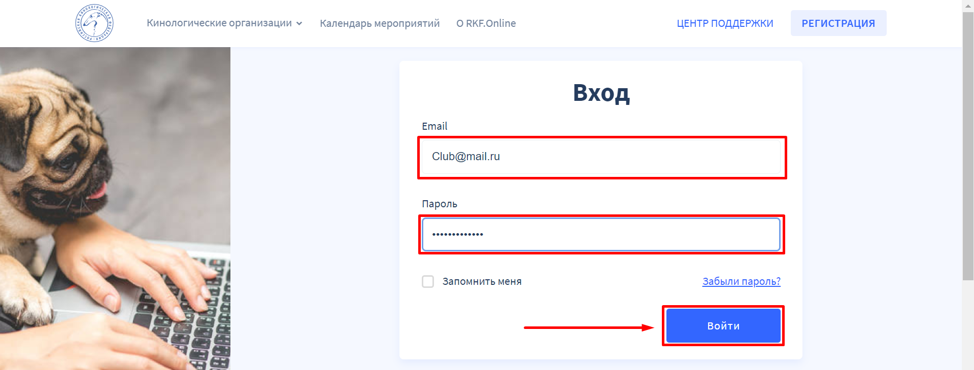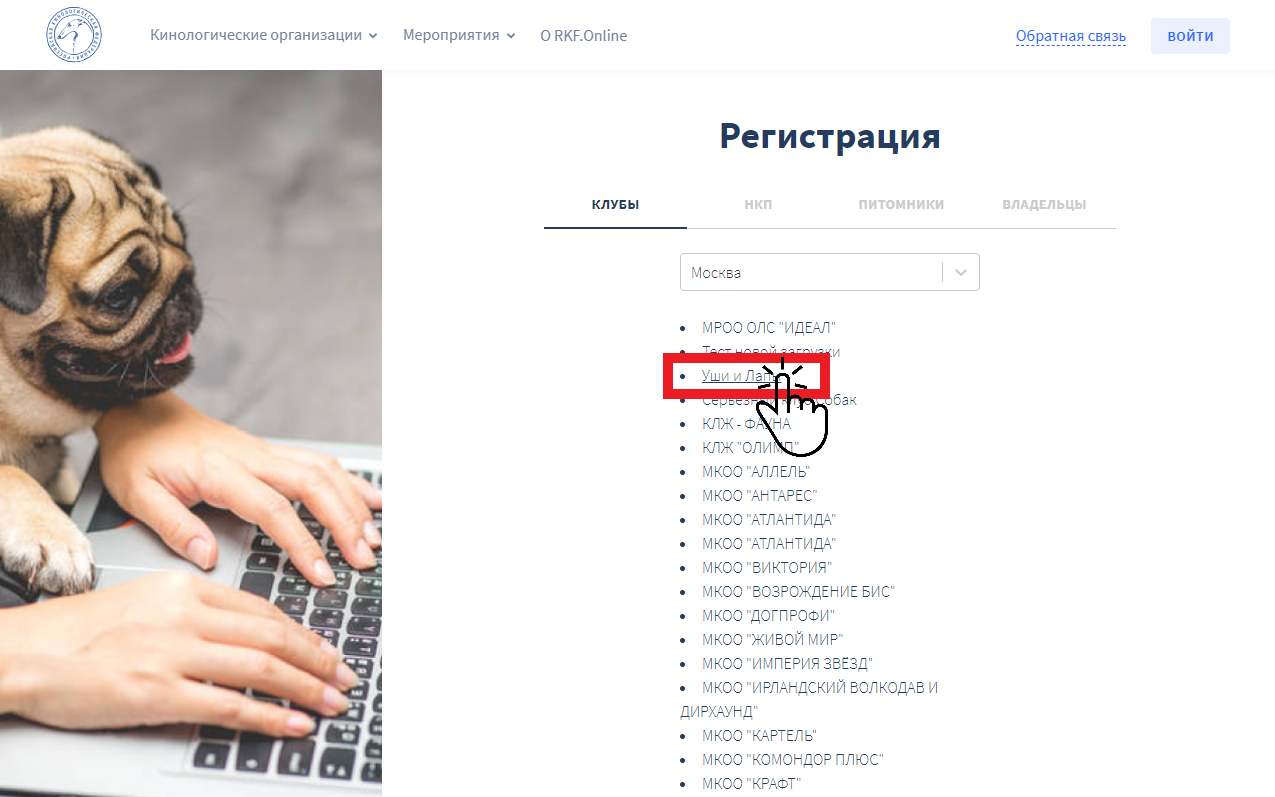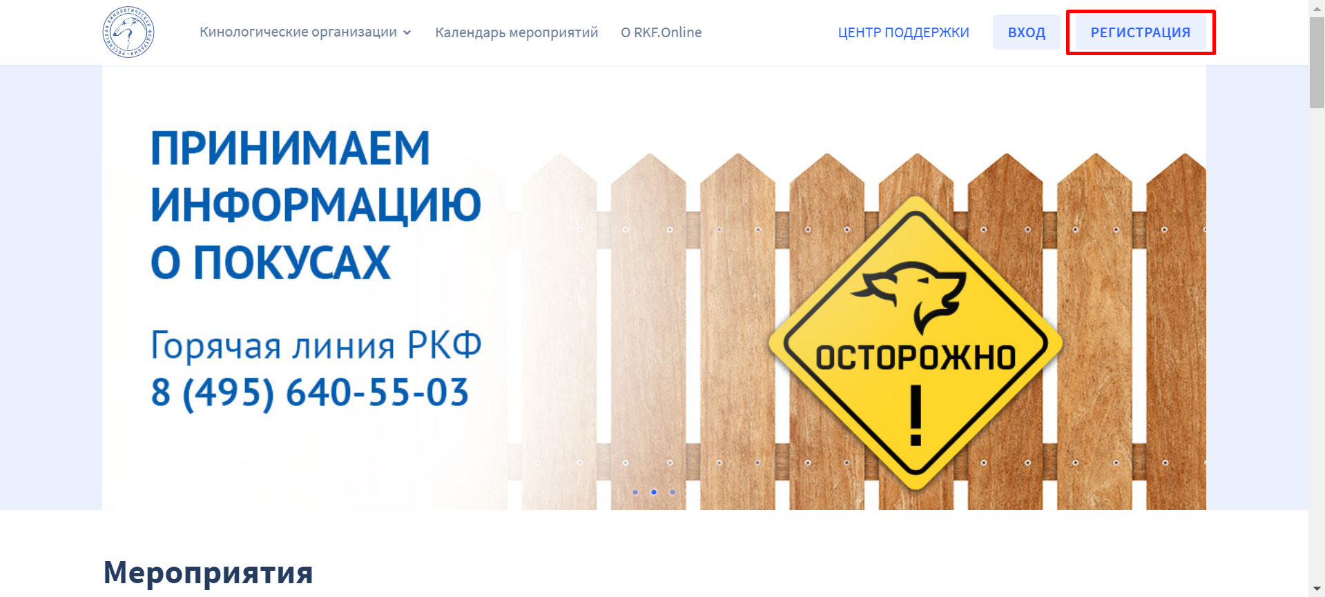 Для того, чтобы зарегистрировать ваш клуб на платформе RKF.Online, необходимо на главной странице сайта нажать на кнопку «РЕГИСТРАЦИЯ» в правом верхнем углу.