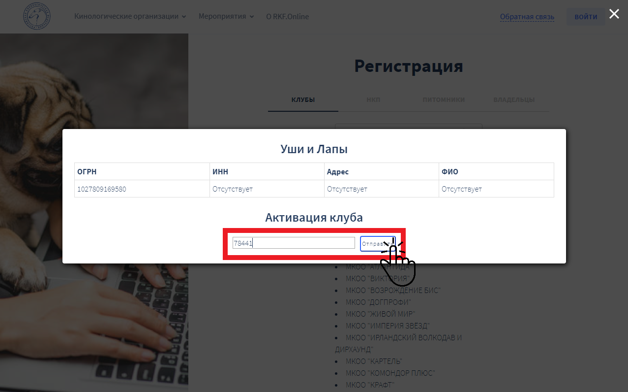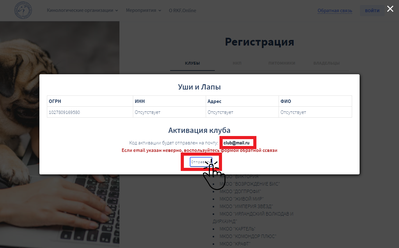 Перед вами откроется всплывающее окно с информацией клуба из базы данных платформы RKF.Online. Самое главное, на что вам нужно обратить внимание — название, ОГРН и e-mail клуба. На указанный адрес электронной почты вы получите код активации после нажатия кнопки «Отправить». Если указан некорректный адрес, сначала обратитесь в поддержку через форму обратной связи, используя кнопку "Центр поддержки".