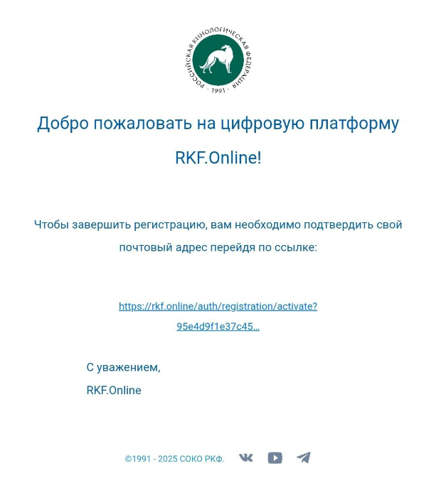 После этого проверьте вашу электронную почту - должно поступить письмо от отправителя "Сервис уведомлений rkf.online" с ссылкой, по которой необходимо перейти для подтверждения адреса электронной почты.